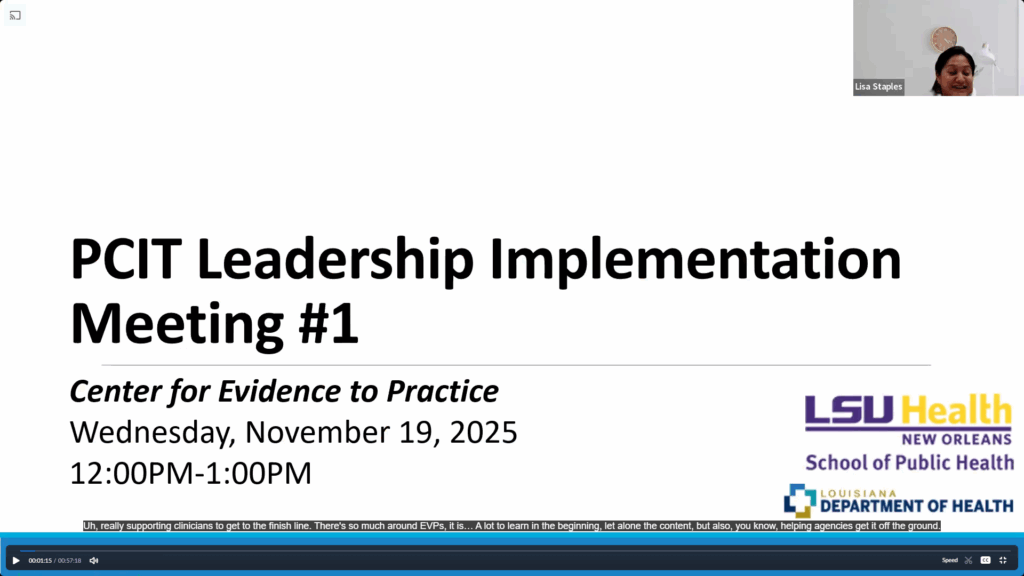 Beginning in late 2024, The Center for Evidence to Practice (Center for E2P) launched a new initiative to help improve implementation of evidence-based practices (EBPs) across Louisiana. Parent-Child Interaction Therapy (PCIT) was one of the many EBPs included in this initiative. This initiative aims to support clinicians who complete training through our Center and are working towards achieving PCIT Certified status. It includes hosting PCIT Senior Leadership meetings to give the clinicians’ agency leadership and supervisors tools to support their staff throughout training as well as the execution of the model with clients.