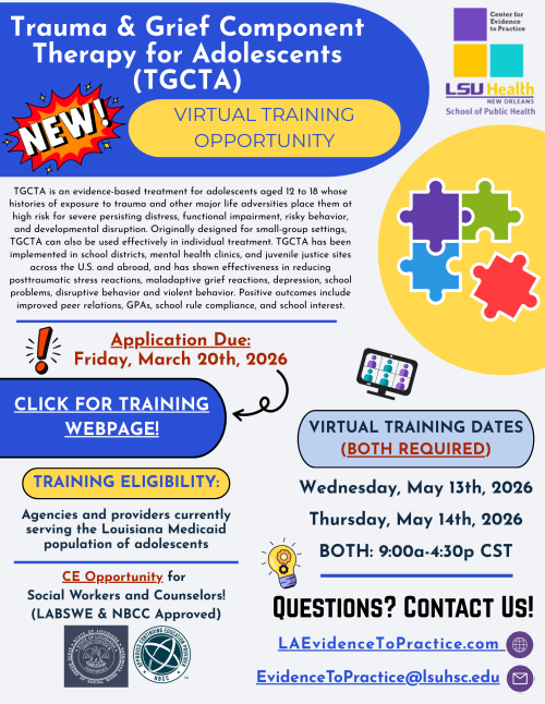 The Center for Evidence to Practice (Center for E2P) is offering an opportunity for behavioral health practitioners in Louisiana to participate in Trauma and Grief Component Therapy for Adolescents (TGCTA) Training.